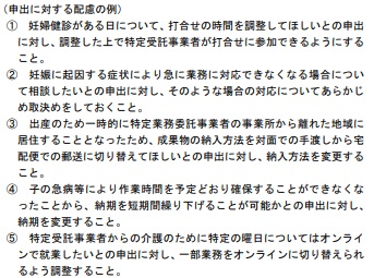 育児・介護の配慮は妊娠や出産も対象に含め、フリーランスからの配慮の申出内容の把握、配慮内容の検討、フリーランスへの伝達・実施、実施しない場合の伝達・理由の説明を義務として求める。申出に対する配慮の例として、「子の急病による納期の短期間の繰下げ」「介護を行う曜日のオンライン就業」などを列挙。一方、「過重な負担を強いる申出の手続」「周囲に迷惑がかかるといった申出を躊躇させる言動」などを、望ましくない取扱として示した。