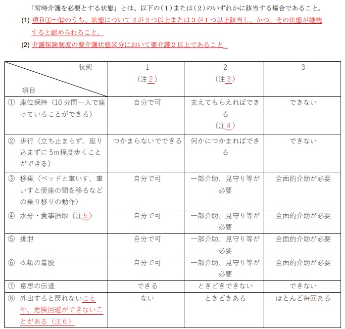常時介護を要する状態は介護保険制度で要介護2以上か、12項目の状態で「できない」などの3が1つ以上、または「一部介助、見守りなどが必要」などの2が2つ以上かに該当すると認められる。新基準では、状態を判断する12項目のうちの⑧⑩⑪を改める(下表)。