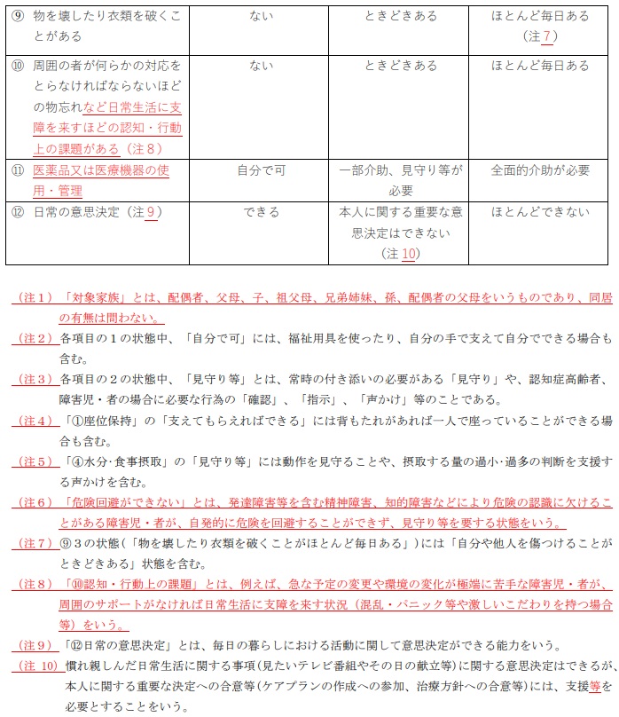 ⑧には「危険回避ができないことがある」と追記し、「危険認識に欠く障害児・者の見守りを要する状態」などと注釈で明記。⑩にも「日常生活に支障を来すほどの認知・行動上の課題がある」と加え、注釈で「急な予定の変更でサポートがなければ混乱する場合」などと具体例を示した。
