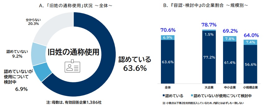 1386社が回答した帝国データバンクの調査で、職場での旧姓の通称使用を「認めている」と63.6%が回答し、「認めていないが検討中」と合わせて7割を超えることがわかった(図)。