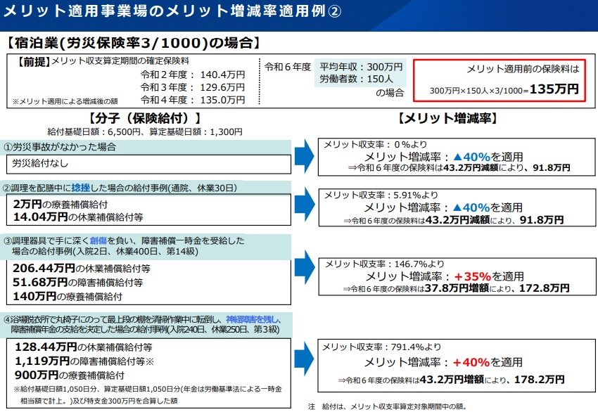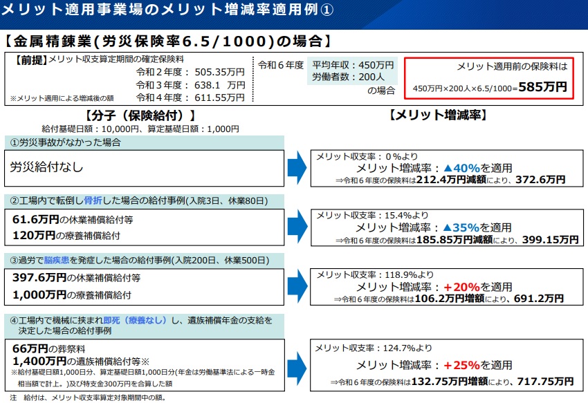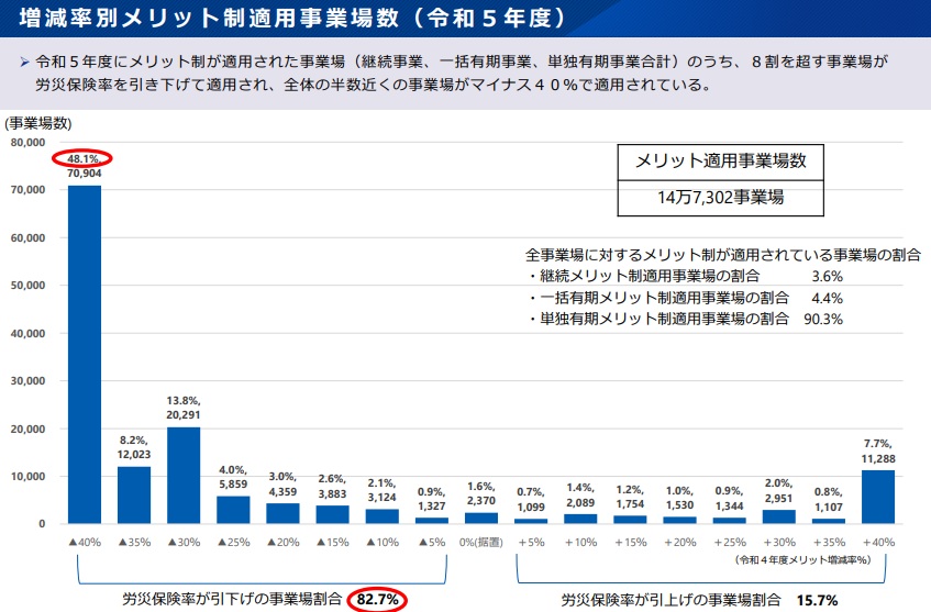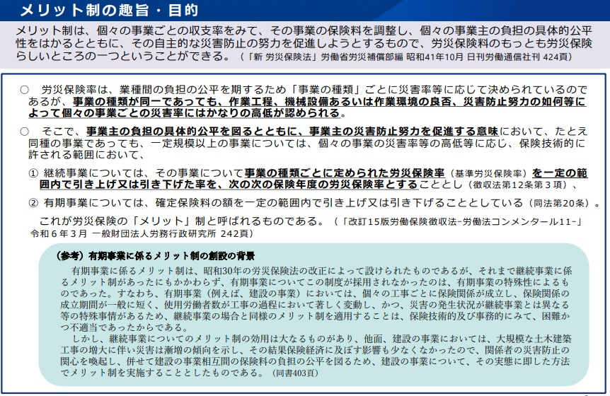 メリット制は、個別の事業場の災害の多寡に応じ、労災保険率または保険料を増減する制度。平均100人以上を使用する継続事業、確定保険料40万円以上の一括・単独有期事業などを対象に、保険料負担の公平性の担保、災害防止努力の促進を図っている。