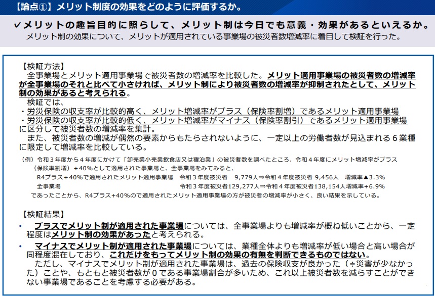 検証結果を受けた意見交換では、廃止を求める声が一部であがったが、災害防止効果を認めて制度を存続すべきとの意見が多数派を形成。ただし保険料増額の不服申立てが多発していること、労働者死傷病報告で虚偽記載・提出する、いわゆる労災かくしが後を絶たないことに対応するため、改善策を講じるべきとの意見で一致した。