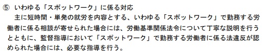 最低賃金・賃金引上げに支援、労働移動の円滑化などに引き続き取り組むよう要請したほか、法改正を見据えてマニュアルを活用したカスハラ対策の促進、学生の相談で把握した就活等セクハラへの適切な対応を要請。また短時間・単発で就労する、いわゆるスポットワークも労働基準関係法令違反が認められた場合には、事業主に必要な指導を行うよう求めている。