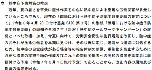 このほか今夏から大幅に強化する熱中症予防対策について、労働安全衛生法施行規則の改正内容の周知に重点化。暑熱下での作業で、早期発見の体制整備、重篤化を防止する措置の実施手順の作成を義務づける6月以降、関係者への指導を徹底するよう要求した。