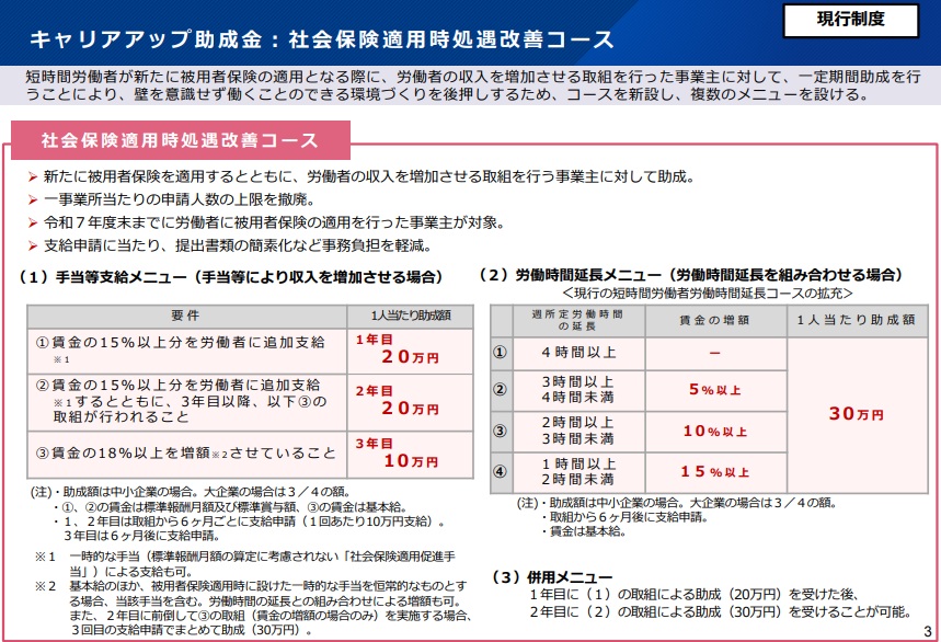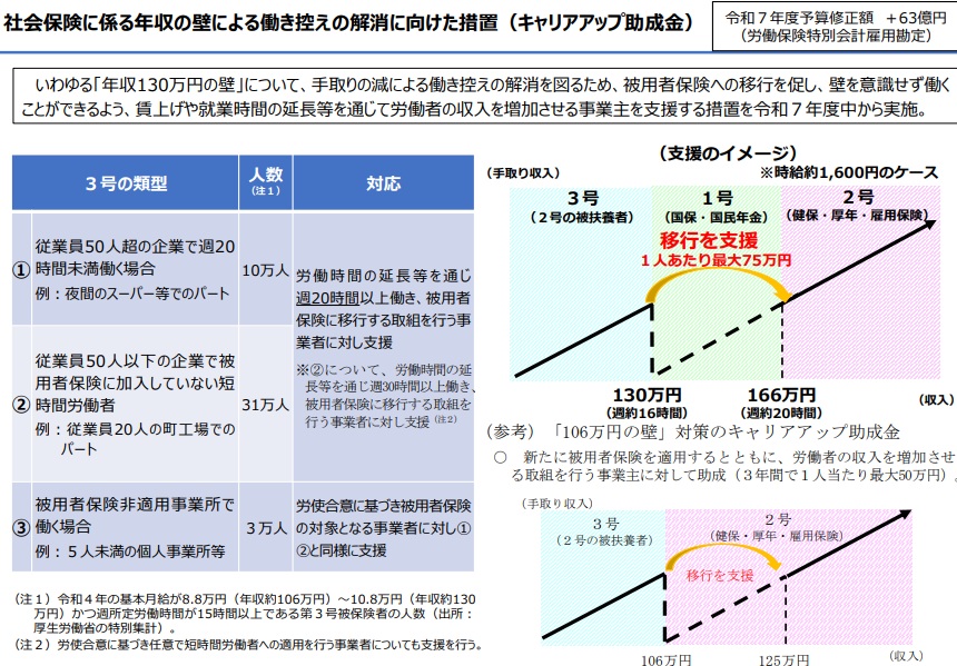 もう一方の年収106万円の社会保険の壁対策については、2023年10月からの年収の壁支援強化パッケージですでに手当。キャリアアップ助成金に「社会保険適用時処遇改善コース」を新設し、被用者保険適用時に賃上げや手当の支給、労働時間の延長などで収入を増加させた場合に、3年間で労働者1人当たり最大50万円を支給するなど、複数のメニューを整備している。