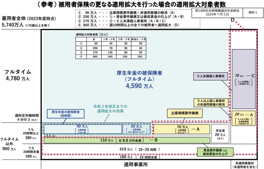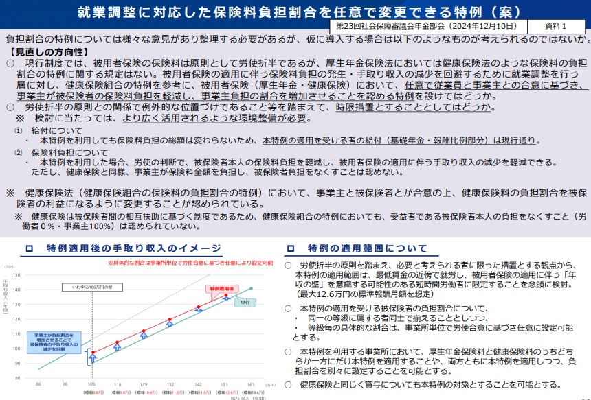 被用者保険の適用拡大では、月額8.8万円の賃金要件廃止を公布3年以内施行と定め、企業規模要件撤廃を段階的な実施に変更。また保険料調整制度を適用拡大の支援措置に位置づけた上で、対象を50人以下規模企業に限定して拡充するなど当初案を改めた(記事下部に別掲)。