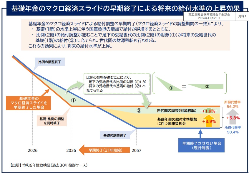 年金改革法案の目玉施策として注目されたマクロ経済スライドの早期終了による基礎年金の底上げは、必要性についておおむね合意形成ができたとしつつも、財源に厚生年金の積立金を活用することや、これに伴う一時的な厚年受給額の減額、追加的に必要となる国庫負担の捻出などに批判が集まり、法案から削除する。