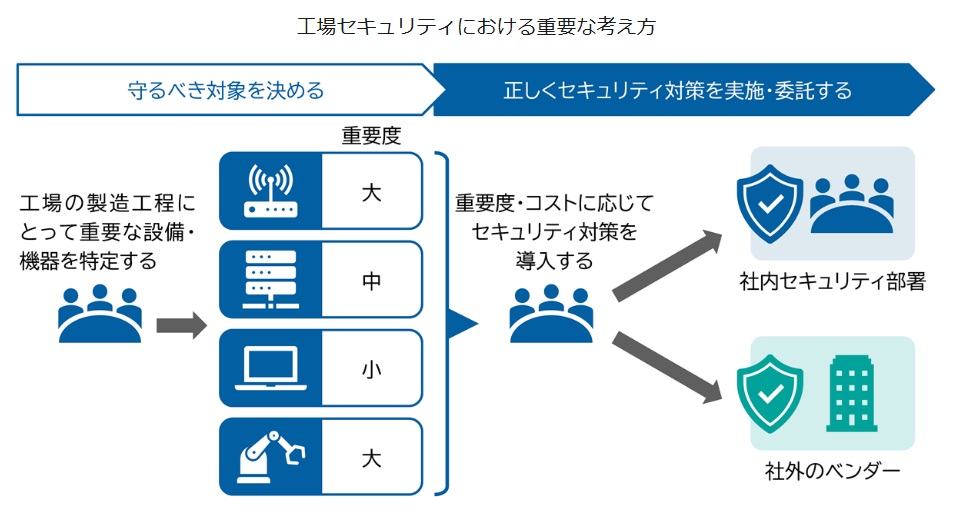 社内のセキュリティ部署と社外のベンダーが協力し、製造工程における設備・機器の重要度を特定した上で、コストも勘案して対策を実施・委託することが重要と強調。具体的な事前準備として、被害発生を想定した訓練、外部の支援先の決定、バックアッププランの作成などを列挙したほか、ゾーンごとにネットワークの分割が可能なルータの導入などの対策も推奨している。