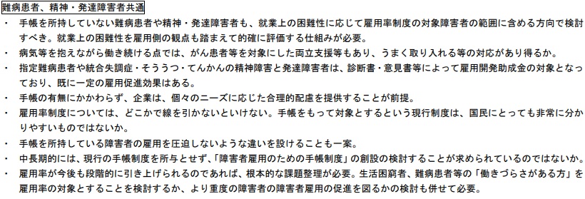 障害者雇用率制度については、難病患者や精神・発達障害者など手帳不所持者について、「対象に含めるべき」「一定の線引きは必要」と両論を併記した上で、中長期的に「現行の手帳とは別の手帳制度を創設すべき」との新たな提案も明記。