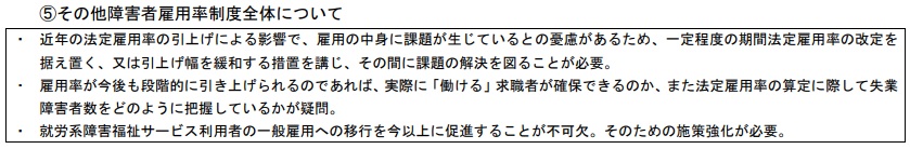 一方、法定雇用率の引上げを一定期間据置き・緩和し、雇用の中身や算定式での失業者数の把握など課題解決に充てるべきとの意見も付記した。