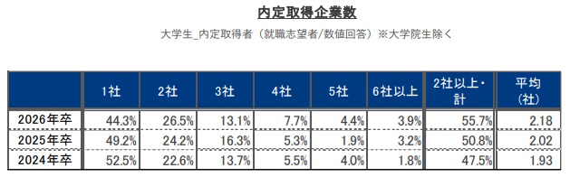 内定獲得企業数の平均は同0.16㌽増の2.18社、2社以上取得する大学生も同4.9㌽増の55.7%に増加。