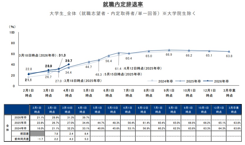 就職内定辞退率も同5.3㌽増の39.7%に上昇し、依然として学生側が有利な売り手市場が続いている。