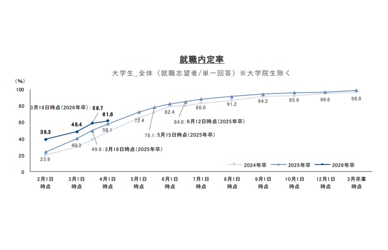 インディードリクルートパートナーズはこのほど、2026年3月卒の大学生の就職内定率が4月1日時点で61.6%になったと発表した。前年比3.5㌽増と上昇し、採用選考活動の解禁日が現行の6月1日以降となった17年卒以降の同日時点の最高値を更新した。