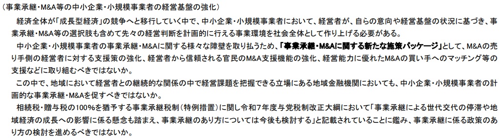 中小企業や小規模事業者の経営基盤を強化するため、事業承継・M&Aに関する新たな施策パッケージを策定する方針を確認。M&Aをめぐる不安や障壁を取り払う狙いで、売り手側の支援策や官民のM&A支援機能、優れた買い手とのマッチングを強化するほか、地域の金融機関の役割、税制拡充なども盛り込む考えだ。