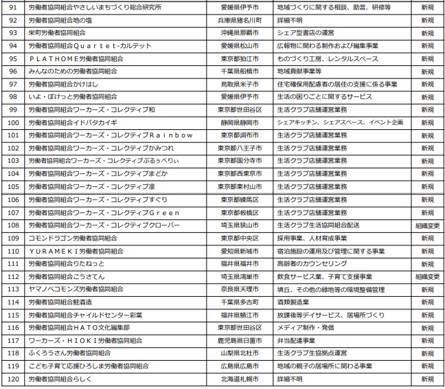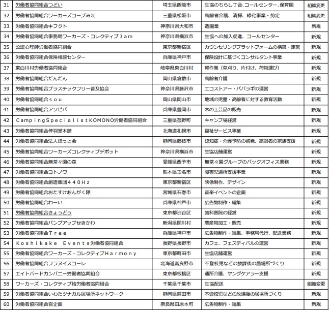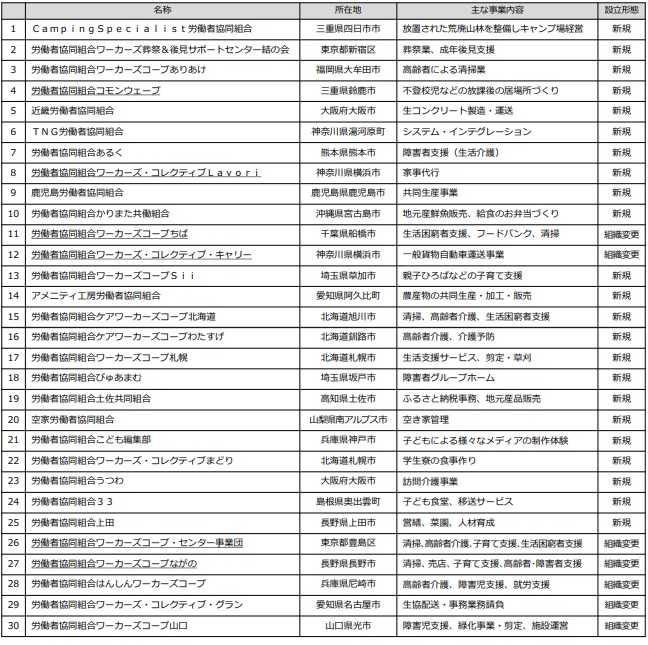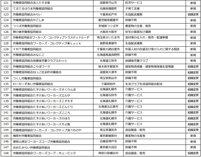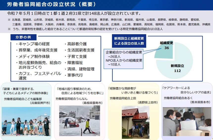厚生労働省は労働者協同組合法の施行から2年7カ月が経過する5月1日時点で、労働者協同組合が1都1道2府31県で148法人の設立を確認したと発表した。