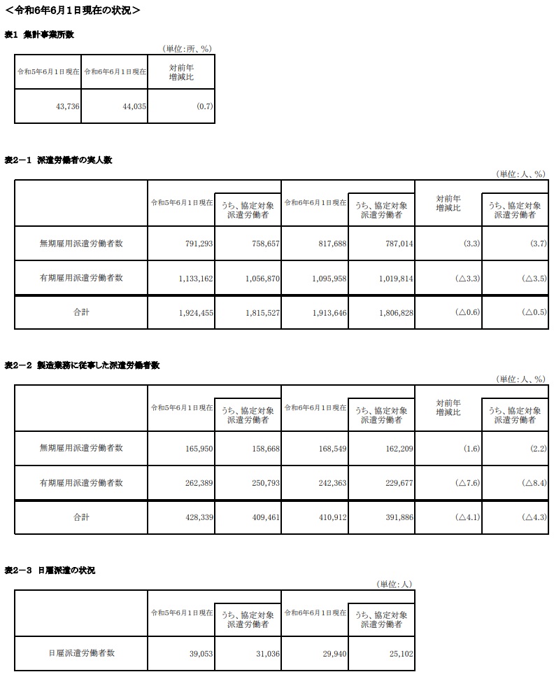 2024年6月1日時点の派遣労働者数が前年比0.6%減の191万3646人となり、微減ながら4年ぶりに減少に転じたことが、厚生労働省の速報値で明らかになった。