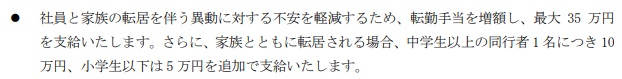 まず社員と家族の転居を伴う異動の不安を軽減するため、転勤手当を増額して最大で35万円支給。さらに家族と転居する場合には、中学生以上の同行者1人につき10万円、小学生以下だと5万円を追加で支給する。