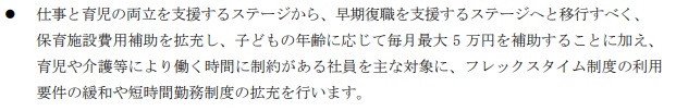 また育児からの早期復職を支援するため、保育施設費用補助を拡充。子どもの年齢に応じた毎月最大5万円の補助をはじめ、育児や介護などで働く時間に制約がある社員を主な対象に、フレックスタイム制度の利用要件の緩和や短時間勤務制度の拡充を行う。