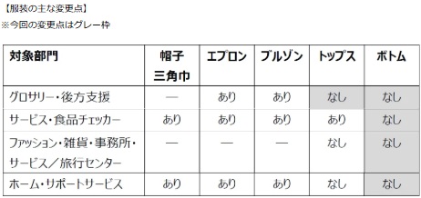 気温や体調の変化に対応できるように、服装を一部自由化するとともに、カーディガンなど女性のみに貸与していた制服を廃止。また従業員だとわかるように、名札から社名のロゴの入ったエプロンやネックストラップの着用に切り替える。