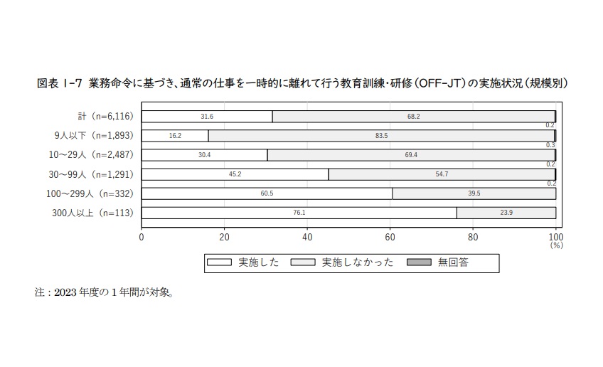 労働政策研究・研修機構の能力開発に関する調査で、OFF-JT(通常の仕事を一時的に離れて行う教育訓練・研修)を実施した企業割合は31.6%だったことがわかった。