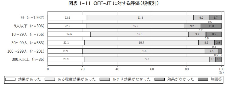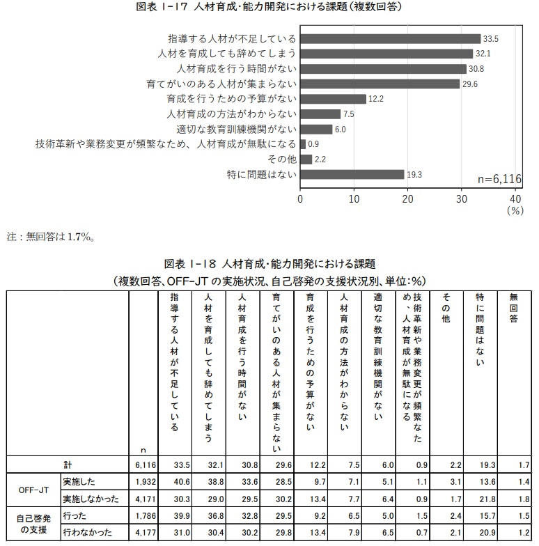うち8割が一定の効果を示唆したが、人材育成・能力開発の課題を問うと、「指導する人材が不足している」が33.5%、「人材育成しても辞めてしまう」が32.1%で多くなっている。