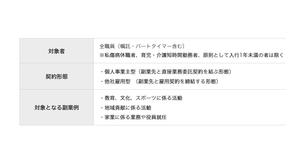 入行1年未満の行員を原則として除くが、パートを含む全職員を対象とする。業務委託契約を直接締結する個人事業主型に加え、雇用契約を結んで働く他社雇用型も容認。教育や文化、スポーツに関する活動、地域貢献に関する活動、家業の業務や役員就任などを想定し、エンゲージメントと地域貢献の向上に繋げる。
