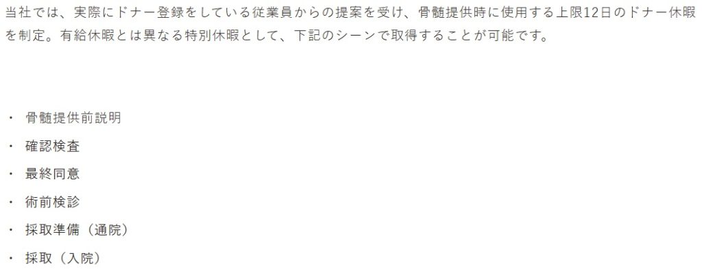ドナー登録した従業員がドナー候補となり、骨髄を提供する際に利用できる特別休暇として制定。採取だけでなく、確認検査や術前検診などで、有給休暇と異なる上限12日間の休暇の取得を認める。