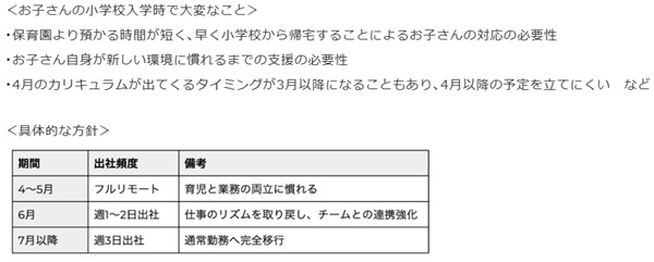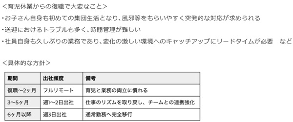 プロシェアリング事業を展開するサーキュレーション(東京都渋谷区)は4月から、母親となった女性社員が育児休業から復職する場合の働き方支援を開始。復職2カ月後まではフルリモート、3~5カ月後までは週1~2日出社とし、6カ月以降からは原則の週3日出社とする。また子の小学校入学のタイミングでも、4月と5月をフルリモート、6月を週1~2日出社と出社頻度を緩和して、7月以降から週3日出社へと戻す。