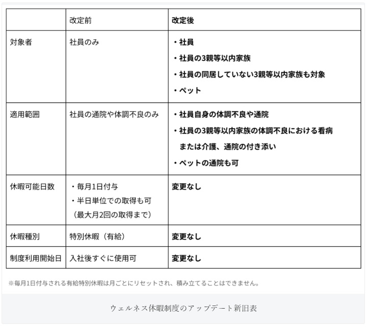 DX支援のスパイスファクトリー(東京都港区)は4月から、独自の有給特別休暇制度「ウェルネス休暇」の適用・対象を拡充した。従前までは、社員自身の通院や体調不良時に毎月1日利用可能としていたが、対象を同居は不問に3等親以内の家族やペットまで拡大。適用範囲についても家族やペットの看護や介護、通院などにも利用できるように改めた。