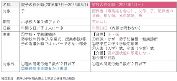 化粧品製造の桃谷順天館(大阪府大阪市)は4月に親子の絆休暇を廃止し、「家族の絆休暇」を新設した。対象範囲を、事実婚を含む配偶者、父母、祖父母、兄弟姉妹、孫へと広げ、日数も5日間から10日間へと拡充。利用事由も、法定の子の予防接種・健康診断のほか、要介護状態を問わない介護や世話を加えた。