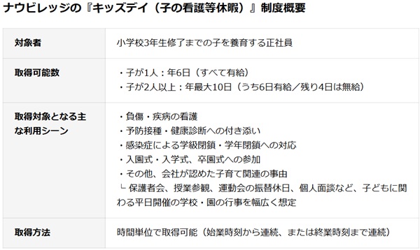 マーケティング支援のナウビレッジ(東京都港区)は4月から、子の看護等休暇に当たる「キッズデイ」を導入。小学校3年生修了までの子を養育する正社員に、年6日の有給休暇を付与する。