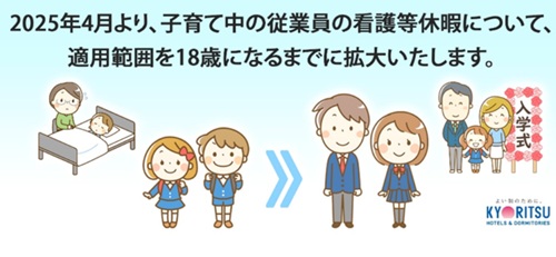 社員寮運営の共立メンテナンス(東京都千代田区)は4月から、子の看護等休暇の対象を「18歳になるまで」へと大幅に拡大している。