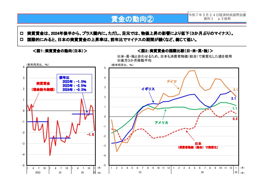 実質値を示す公的統計について、国際比較を容易にする手法を検討。欧米諸国より総じて低く出ている毎月勤労統計調査の実質賃金の算定に用いる消費者物価指数に関し、アメリカやイギリス、ドイツと同様に「持家の帰属家賃を含む総合とすべき」との意見が大勢を占めた。