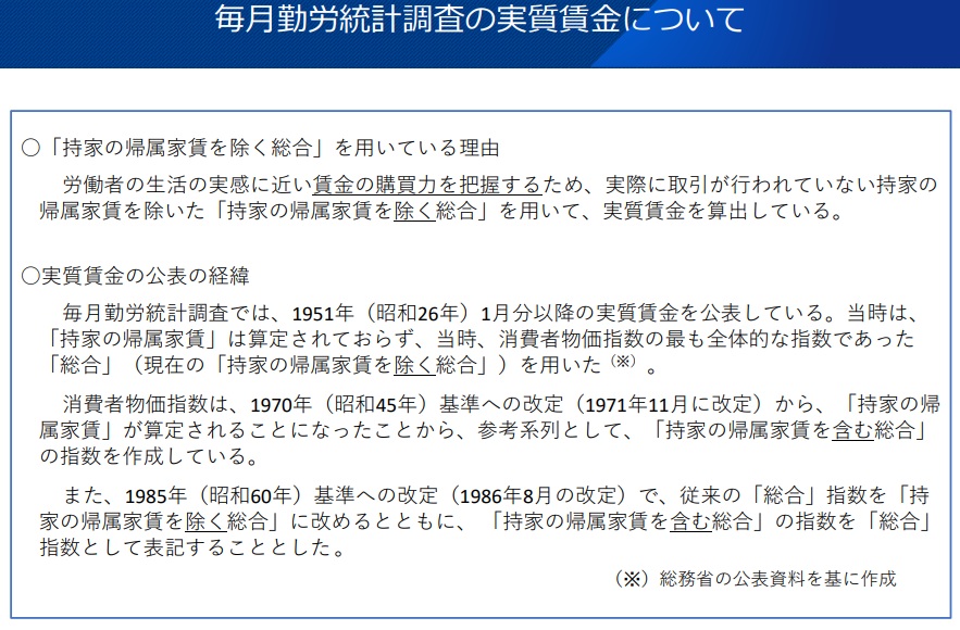 持家の帰属家賃は、持家を借家と考えて支払われる家賃。これまでは「除いた総合」を使っていたが、「含めた総合」で算出した場合より実質賃金が低く出ることが問題視されていた。
