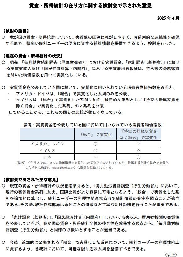 従前までの持家の帰属家賃を除いた総合で算出した実質賃金とともに、速やかに追加的に併記することで意見はおおむね一致した。