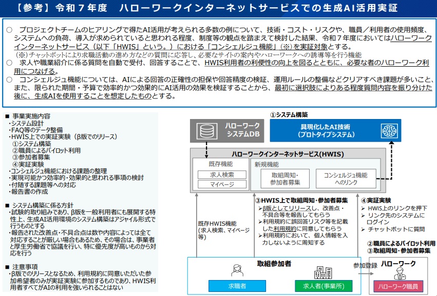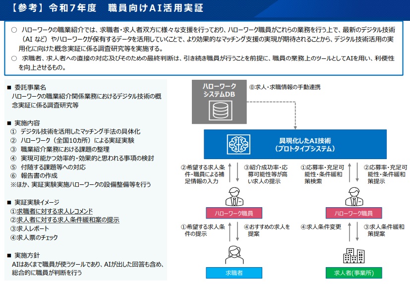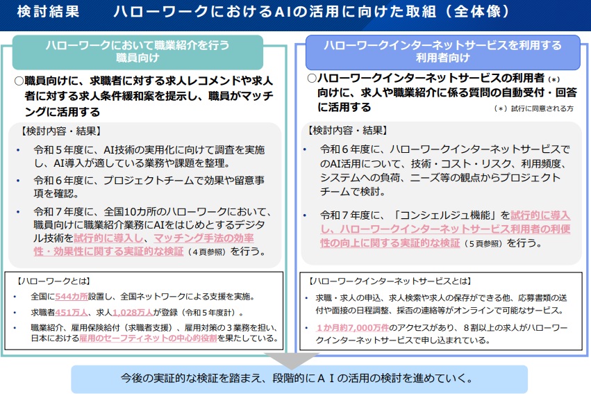 今年度にも、全国10カ所のハローワークで職員によるデジタル技術を用いたマッチング手法を検証するほか、サービス面でチャットボットを利用するコンシェルジュ機能を試行的に導入する。