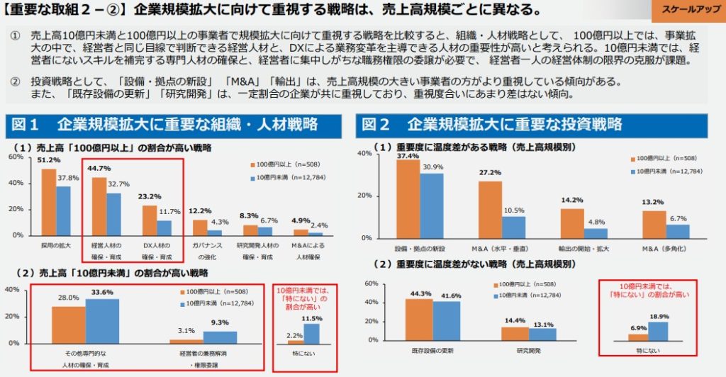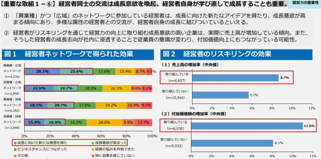 成長・発展を遂げる経営力を強化する施策として、異業種経営者との交流、学び直し、適切な価格設定、経営情報の共有などが有効と指摘した。