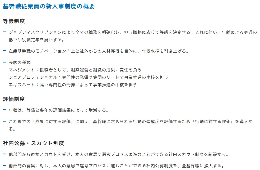 具体的には、等級について役職者として組織運営と組織の成果に責任を負う「マネジメント」、専門性の発揮や集団のリードで事業推進の中核を担う「シニアプロフェショナル」、高い専門性の発揮で事業推進の中核を担う「エキスパート」に複線化。報酬は従前までの成果に対する評価に加え、新たに基幹職に求められる「行動の評価」を導入し、等級と各年の評価結果で決める。