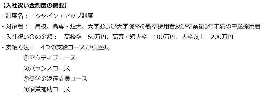 奨学金返還支援コースのほか、奨学金を借入していない入社者も平等に利用できるように、アクティブコース・バランスコース・家賃補助コースの全4コースを整備。支給額は学歴ごとに設定し、高校卒には50万円、高専・短大卒には100万円、大卒以上には200万円を入社祝い金として支給する。