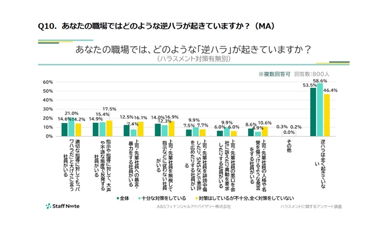 逆ハラの種類(表)では、「指示や指導に大声や不遜な態度で反発する」が14.9%で最多。「適切な指導に『パワハラだ』と大げさに言う」が14.6%と僅差で続いたが、対策の有無別にみると実施職場で21.0%、未実施職場で14.2%となっており、対策が却って過剰なハラスメント意識を生んだ可能性を示した。