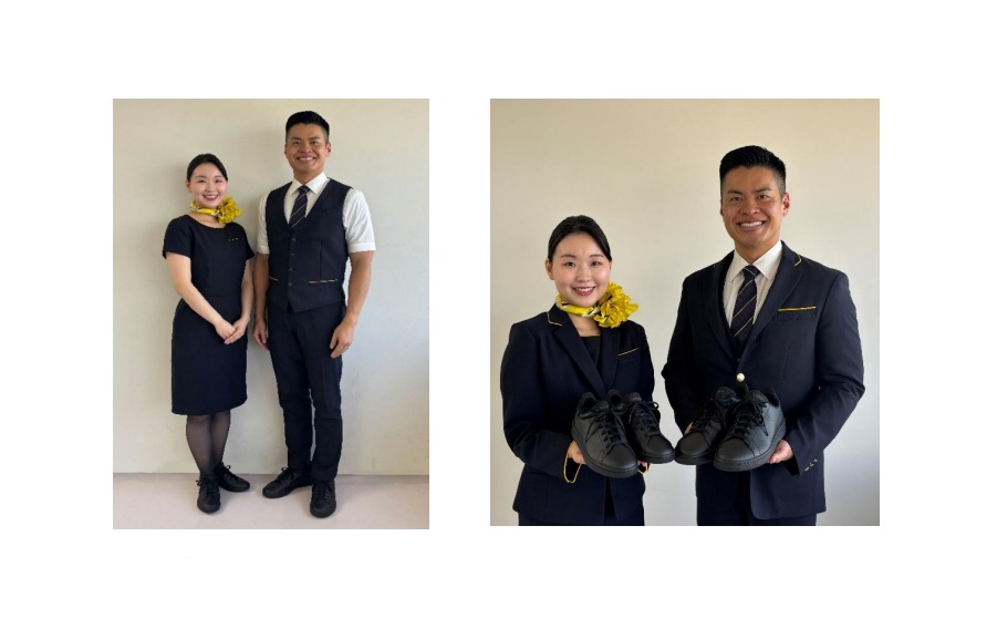 スカイマーク(東京都大田区)はこのほど、地上旅客職・客室乗務職のスニーカーでの勤務を解禁した。長時間の立ち仕事の負担軽減、動きやすさを考慮して従前までの黒色の革靴に加え、ソールの高さが4㎝未満の黒の単色のスニーカー着用を可能にした。
