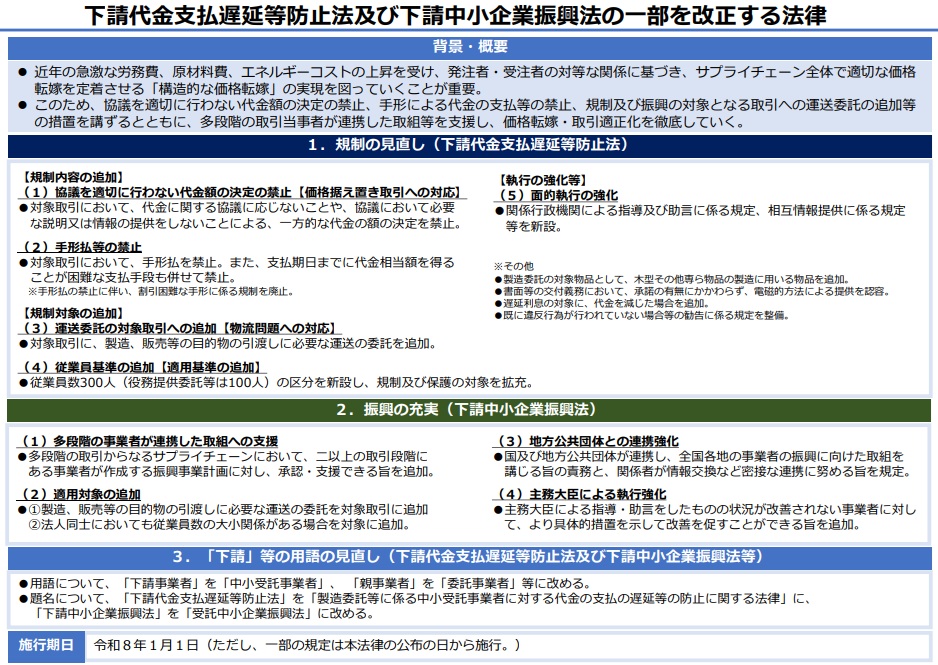 法律名を、順に「製造委託等に係る中小受託事業者に対する代金の支払の遅延等の防止に関する法律」「受託中小企業振興法」へ見直す。また親事業者を「委託事業者」、下請事業者を「中小受託事業者」などへと改称。一部を除き、2026年1月から施行する。