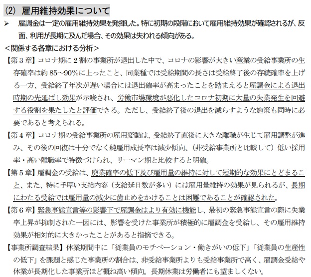 支給が異例の大規模となったコロナ特例だが、初期段階で雇用維持効果が確認されたものの、利用が長期に及ぶと効果が失われる傾向を示唆。