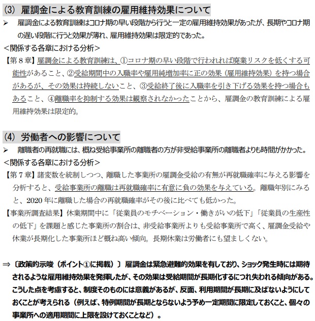 また雇調金の教育訓練もコロナ期の遅い段階に行われると効果が薄く、離職者の再就職も雇調金受給事業所のほうが時間がかかっていたなどと指摘した。