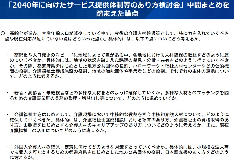 マッチング、業務の切り出し、キャリアアップなどの効果的な手法に加え、外国人介護人材の定着支援、潜在介護福祉士の掘り起こしなども論点となる。