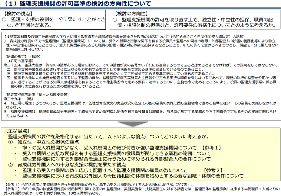 25条1項では、許可の申請で満たす必要がある基準を列挙した。1号に「営利目的の法人でないこと」のほか、2号以下で事業遂行能力や財産的基礎を有すること、個人情報の適正管理と秘密を守る措置を講じること、監理型育成就労実施者と密接な関係を有しない者として監査を公正かつ適正に遂行できる知識・経験を有すること、外国の送出機関から監理型育成就労の求職申込みの取次ぎを受けようとする場合に、取次ぎ契約を締結することなどを明示した。