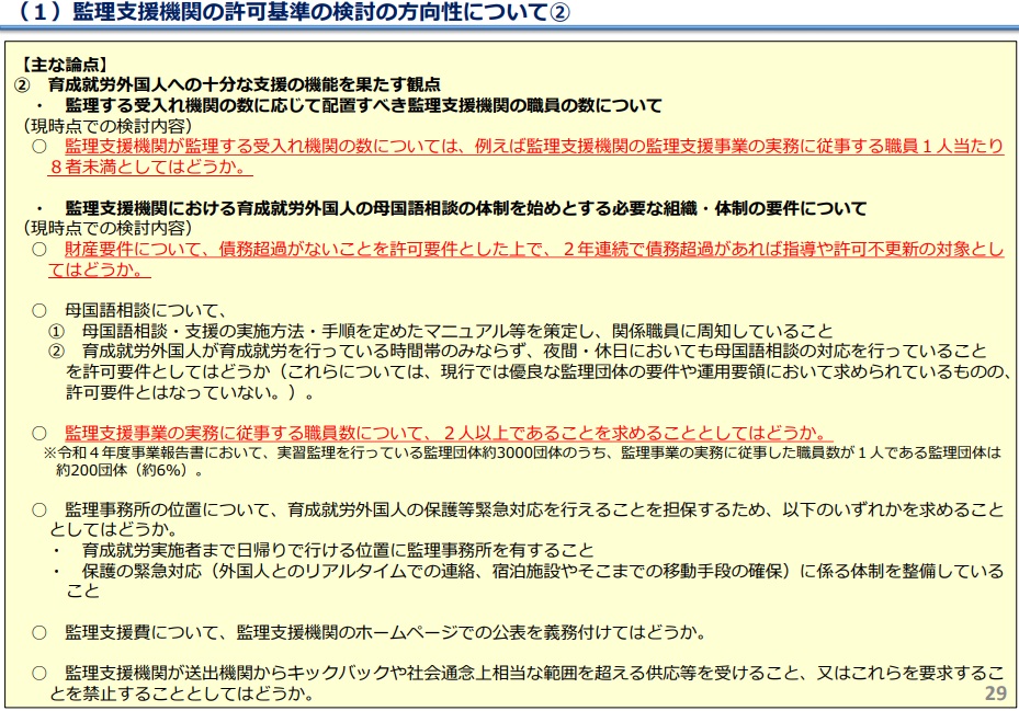 詳細は、省令に書き込む。例えば、体制要件として「受入れ機関8者未満かつ育成就労外国人40人未満であること」、送出機関との関係についても「キックバック・社会通念上相当な範囲を超える供応を受けること、これを求めることの禁止」などを示す。