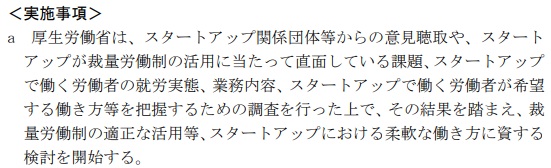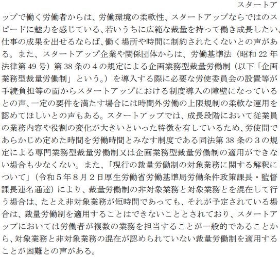 答申の要求を具体的にみていくと、まず技術革新などで急成長するスタートアップに対しては、裁量労働制の活用を念頭に置き、柔軟な働き方を手当する方向で検討するよう求めた。関係者からの意見聴取や調査を通じて、就労実態や裁量労働制活用の際の課題を把握し、スタートアップの労働者が希望する働き方を実現すべきと明示した。