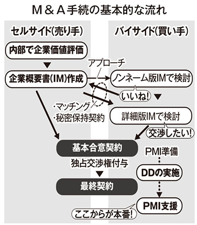M&A手続きの基本的な流れは、下図表のとおりです。ポイントとしては、両当事者で基本合意を締結することで、独占交渉権が付与され、買収価格の適正性を判断するためのデューデリジェンス(DD)が実施されるという点です。