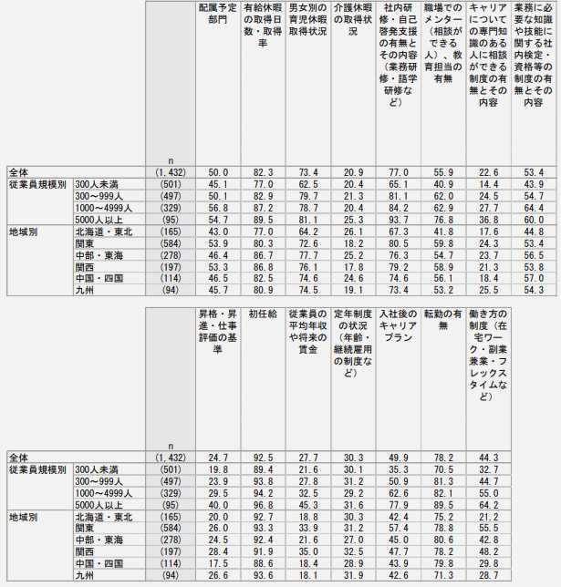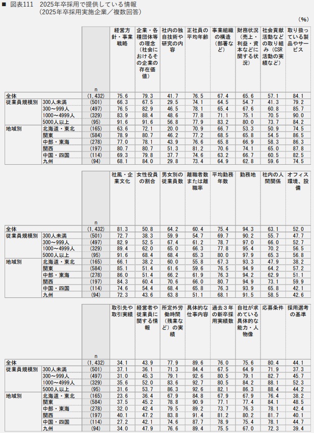 リクルート就職みらい研究所の「就職白書2025」によると、25年大学・大学院卒に企業が提供した情報は「勤務地」が94.3%で最多。以下、「初任給」「具体的な仕事内容」「製品・サービス」「有給休暇の取得日数・取得率」「社風・企業文化」「応募条件」までが8割を超え、「残業の実績」「社内研修・自己啓発支援の内容」「正社員の平均年齢」「経営方針・事業戦略」「平均勤務年数」が7割台後半で続く。